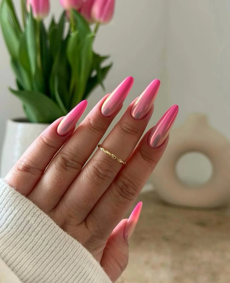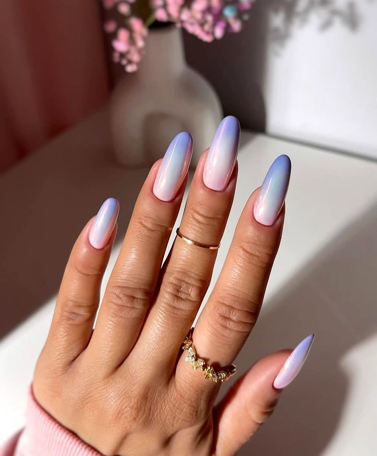 Der klassische milchige Farbverlauf bleibt dezent im Hintergrund, während sich darüber ein feiner, irisierender Schimmer legt – wie ein Hauch Zauberstaub. Dieser Look ist edel, feminin und hat einen fast elfenhaften Touch.