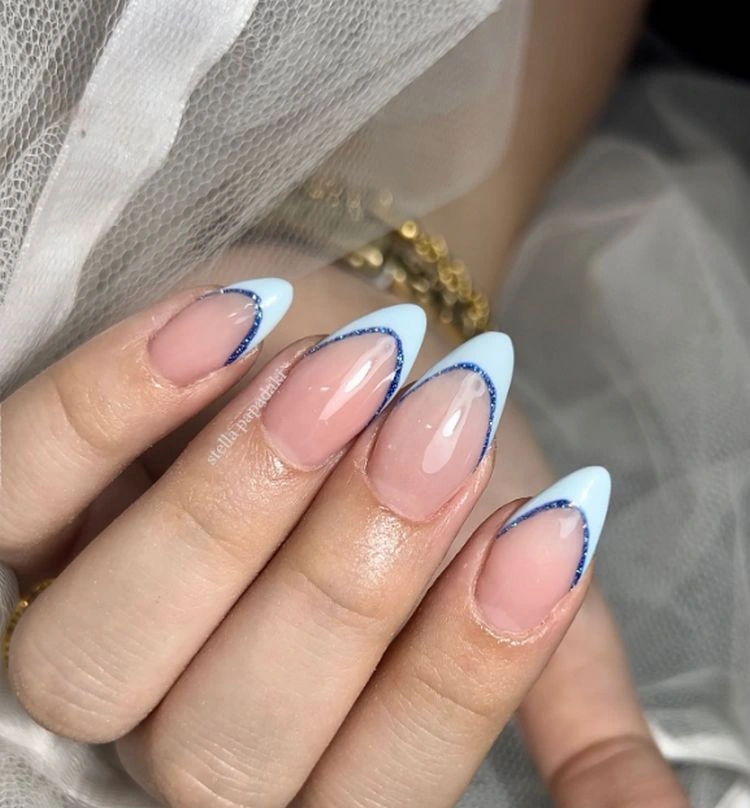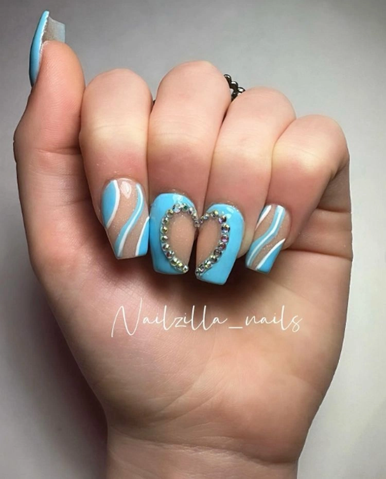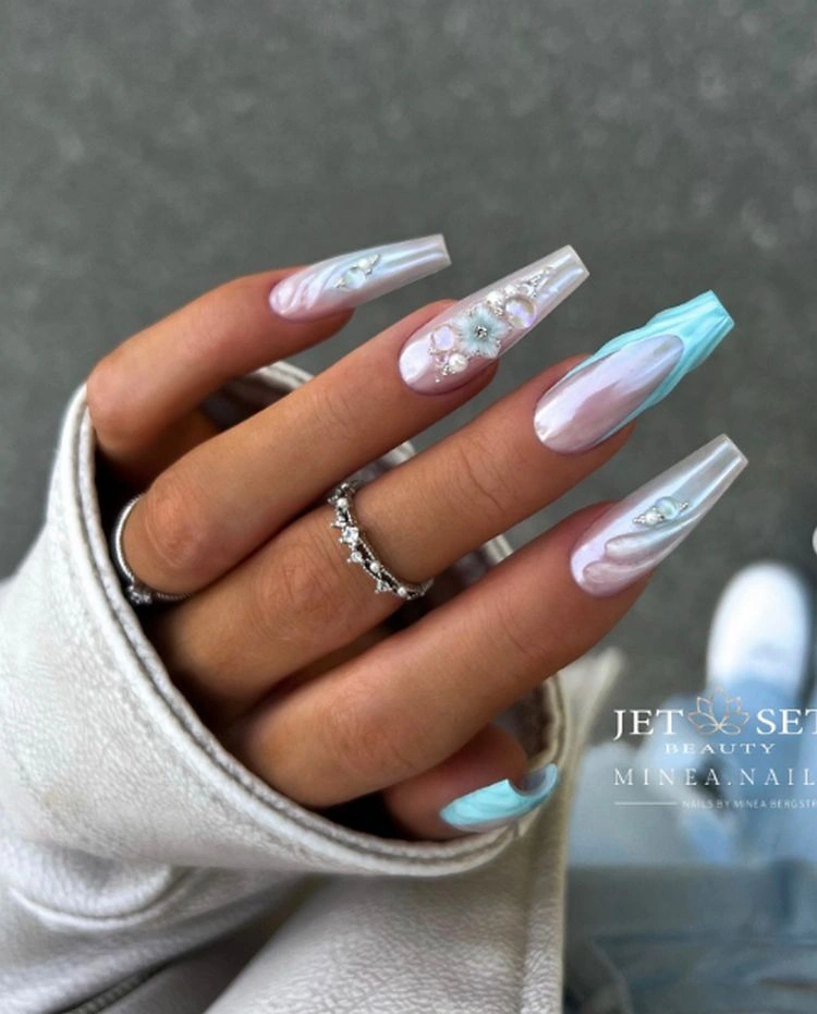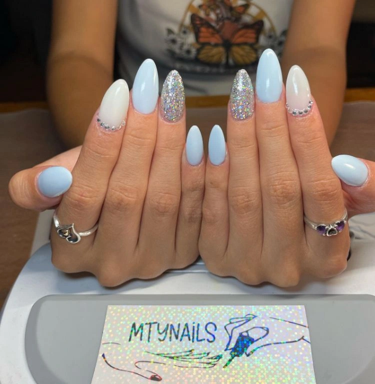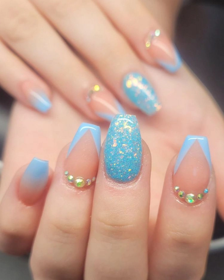 Wir lieben diese Maniküre und ihren glitzernden Stil. Mit Juwelen oder Strasssteinen besetzt, werden Ihre babyblauen Gelnägel schimmern wie eine sternenklare Nacht.