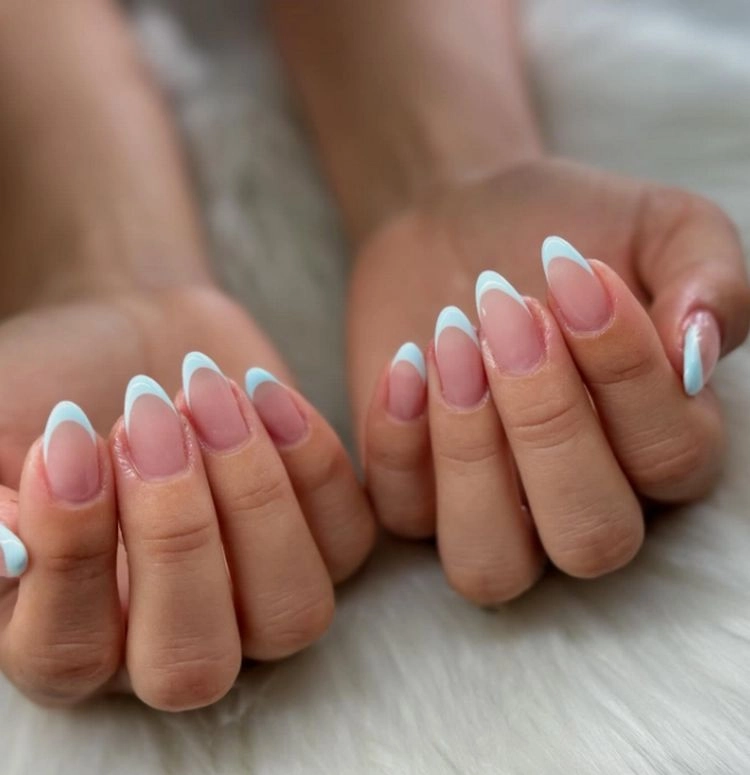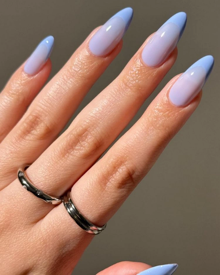 Denken Sie darüber nach, einen zarten Farbverlauf von der Mitte des Nagels bis zur Spitze zu machen, um eine sanftere Version der berühmten französischen Maniküre zu erhalten. Bei diesen modernen babyblauen Spitzen, die in eine blasse Grundierung übergehen, ist keine scharfe Linie in Sicht.