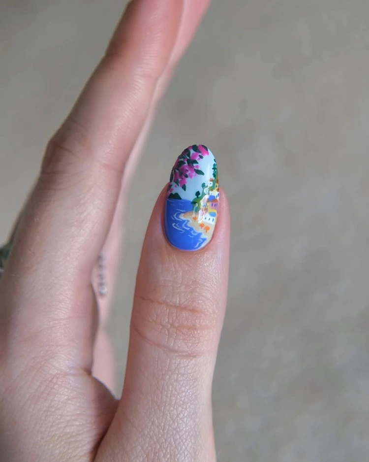Ein einziger Nagel, der mehr erzählt als tausend Worte: Auf zartem Untergrund entfaltet sich eine kleine, gemalte Traumlandschaft – die Amalfiküste in Miniatur. Pastellfarbene Häuser klammern sich an steile Felsen, ranken sich hinauf wie bunte Bonbons über dem tiefblauen Meer. Dazwischen ein Hauch von Grün – Zypressen oder Zitronenbäume, je nach Fantasie – und vielleicht ein winziges Boot, das sanft über die Wasseroberfläche gleitet. Dieser Akzentnagel ist wie ein handgemaltes Souvenir aus Positano oder Ravello: filigran, verspielt und voller mediterraner Magie. Die übrigen Nägel halten sich dezent – in softem Blau, Creme oder einem leichten Zitrusgelb – und lassen der Miniaturkunst die volle Bühne.