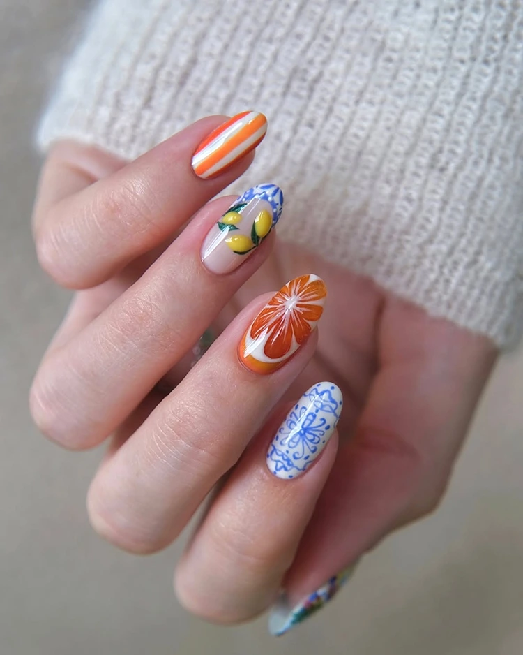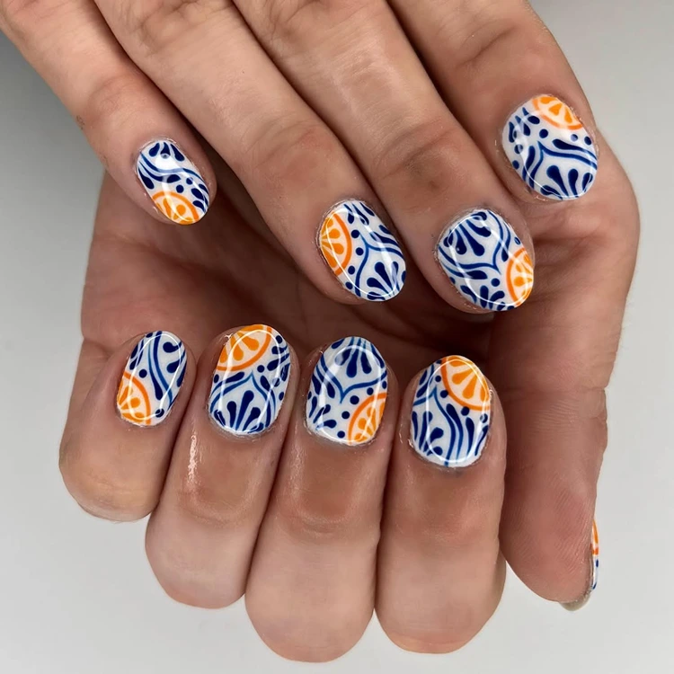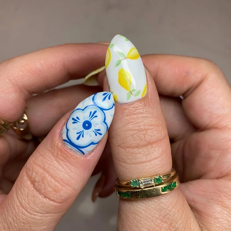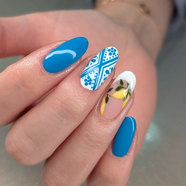 Dieses Design ist wie ein Kurzurlaub an der Amalfiküste: strahlende Zitronen in sattem Gelb treffen auf filigrane, mediterrane Kachelmuster in Blau und Weiß – ein Mix aus Frische, Eleganz und verspieltem Sommerflair. Auf einzelnen Nägeln blitzen kleine Zitronenzweige mit zarten grünen Blättern hervor – wie frisch gepflückt aus einem Zitronenhain in Sorrento. Die restlichen Nägel sind mit detailreichen Mustern verziert, die an handbemalte Majolika-Fliesen erinnern – kunstvoll, edel und mit einem Hauch italienischer Nostalgie.