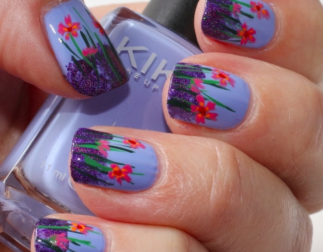 Fingernägel mit lila Lack und Blumen – mit der Technik One Stroke bemalt
