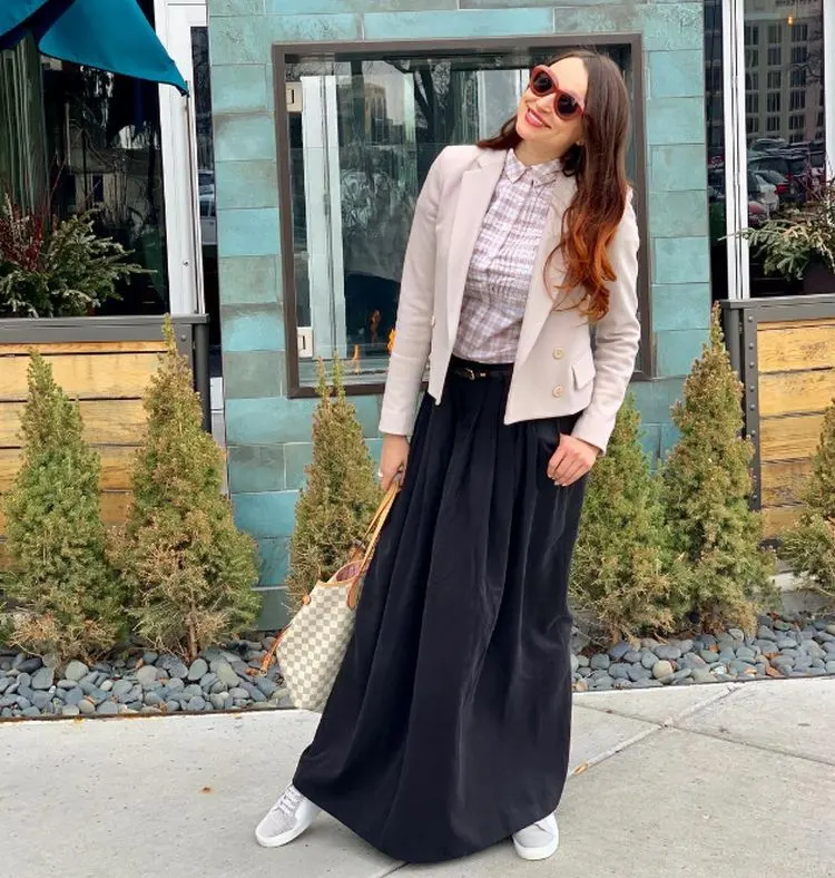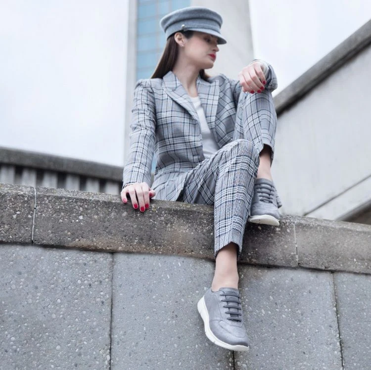 Stellen Sie ein trendiges, urbanes Outfit zusammen mit einem Paar grauer Sneaker, einer High-Waisted-Jeans oder einem Maxi-Rock, einem karierten Hemd und einem stylishen Blazer.