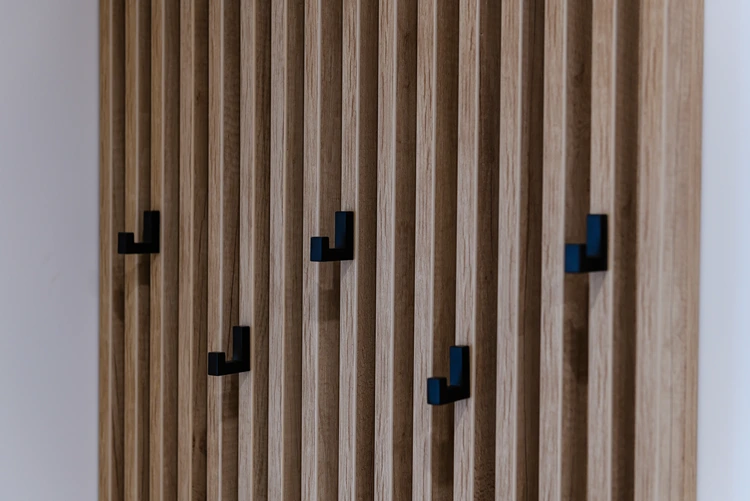 Minimalistische garderobenhaken auf vertikalen akustikpaneelen in eiche