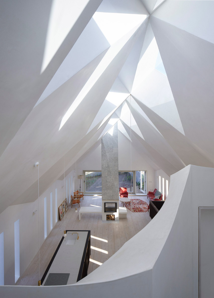 Das Haus besitzt eine moderne facettierte Decke, die an die Kirchenbauten des deutschen Architekten Gottfried Böhm erinnert. Große, dreieckige Oberlichter sorgen für viel Licht und schaffen einen hellen, freundlichen Innenraum.