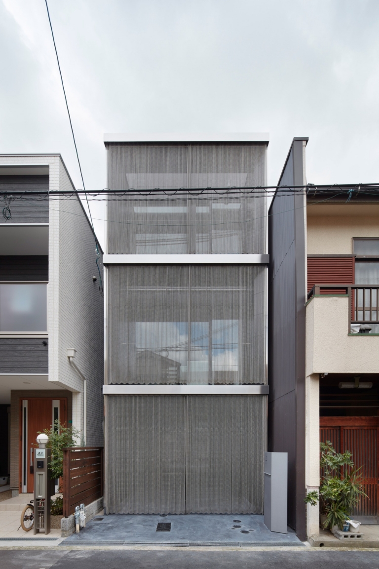 Metallvorhänge hängen vor den Fenstern dieses dreieinhalb Meter breiten Hauses in Osaka von FujiwaraMuro Architects, das über zwei Ebenen mit mehreren Treppen verfügt. Die lokalen Architekten wurden beauftragt, ein schmales Haus zu entwerfen, um ein abgerissenes Gebäude im Handelszentrum von Honshu zu ersetzen. Dieses ist vor allem wegen seiner modernen Architektur bekannt. Das dicht gedrängte Gelände und die städtische Umgebung erforderten ein Design, das viel natürliches Licht bieten kann, ohne die Privatsphäre des Hausbesitzers zu beeinträchtigen. Die Antwort der Architekten war die Schaffung eines schlanken dreistöckigen Hauses mit raumhohen Fenstern, die von einem Kettenvorhang aus rostfreiem Stahl zurückgesetzt wurden. Dieser lässt somit Licht herein und schützt gleichzeitig die Privatsphäre.