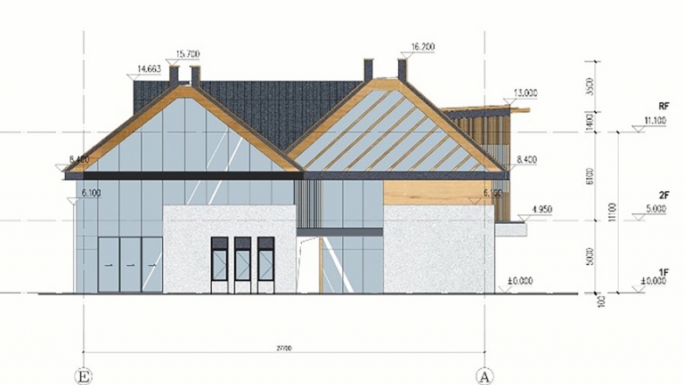 Die Spiegelfassade mit großzügig verglasten Flächen direkt unter dem Dach schafft einen spannenden Kontrast zum aufwendig gestalteten Satteldach. Sie tritt dezent in den Hintergrund und lässt es seinen großen Auftritt feiern. Die vielen Fenster verleihen dem Satteldach einen schwebenden Charakter und feiern einen Sieg der Leichtigkeit der minimalistischen Architektur über die Schwerkraft.