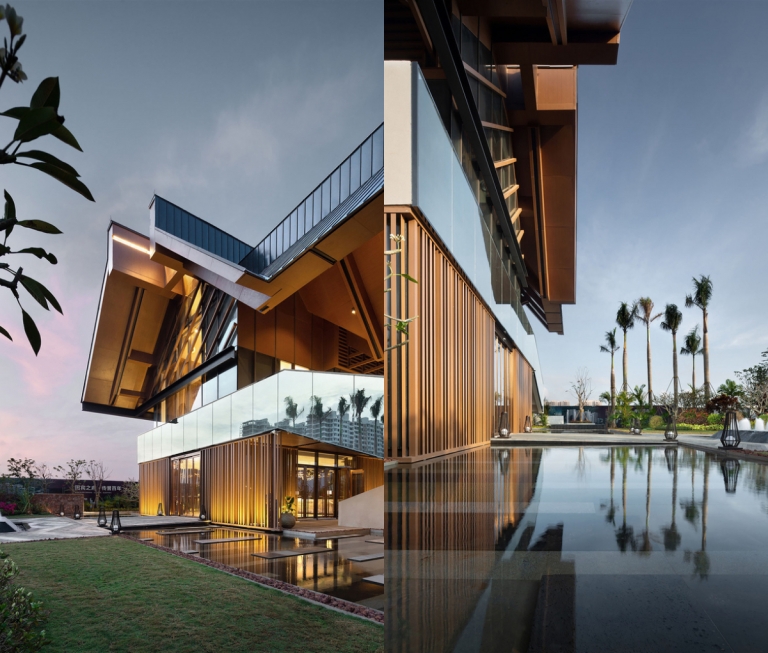 Die Satteldächer sind traditionell ein wichtiger Teil der Baukunst Chinas. Die Architekten von PTArchitects wollten mit ihrem Projekt die fernöstliche Architektur ehren und haben sich deswegen entschlossen, die Dynamik des chinesischen Daches modern zu interpretieren. So laufen zum Beispiel die Dachsparren spitz zu und sind, ebenfalls wie die traditionellen Satteldächer aus der Provinz Hainan, mit einem Abschlusselement gekrönt. Der klassische Baustoff in China – Holz – kam auch bei diesem Projekt reichlich zum Einsatz. Das Dach des Ausstellungszentrums ist aus einheimischen Holzarten errichtet worden und erstellt eine visuelle Verbindung zwischen dem modernen Gebäude und den naheliegenden traditionellen chinesischen Häusern.