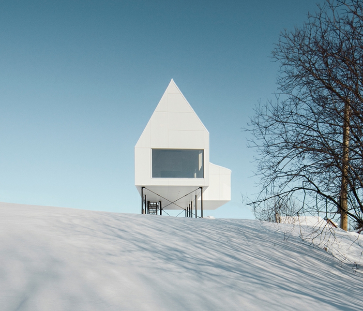Das Haus befindet sich in Quebec in Kanada und nennt sich „High House“. Weißer Zement wird für die Gestaltung der Fassade verwendet und passt sich wunderbar dem Schnee an. So scheint es, als würde das Haus mitten aus dem Schnee emporsteigen. Ergänzend zum modernen, schlichten Design besitzt die Hütte auch ein energieeffizientes Design.
