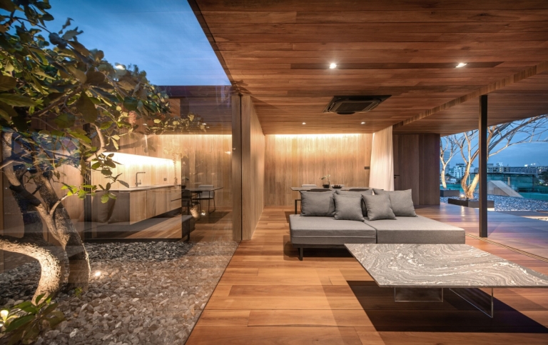 In Bezug auf die Funktion wollte der Eigentümer, dass die Wohnung auf dem Dach für seinen privaten Gebrauch steht. Dies lag vor allem daran, dass er nicht häufig Gäste empfängt. In Anbetracht dessen hielt es das Team für interessant, das Projekt noch minimalistischer als sonst aussehen zu lassen. Die Grenze zwischen jedem Raum ist durch einen Innenhof verbunden. Der Funktionsbereich ist nach dem Raster der darunter liegenden Pfeiler der Wohnung unterteilt, sodass sich ein Layout mit sechs Rastern ergibt.