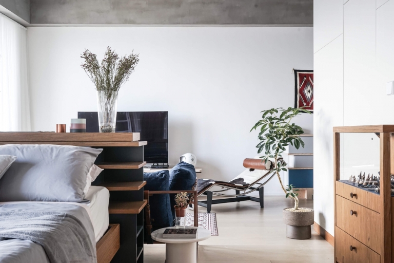 Halbhohe Mauer bietet Sichtschutz für den Schlafbereich in der Einzimmerwohnung