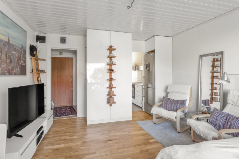 Die weißen Wände und Möbel lassen die Einzimmerwohnung optisch größer erscheinen