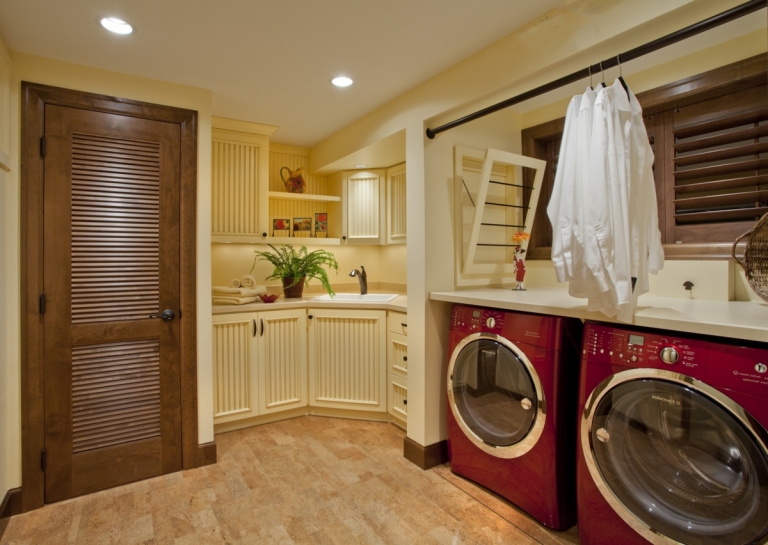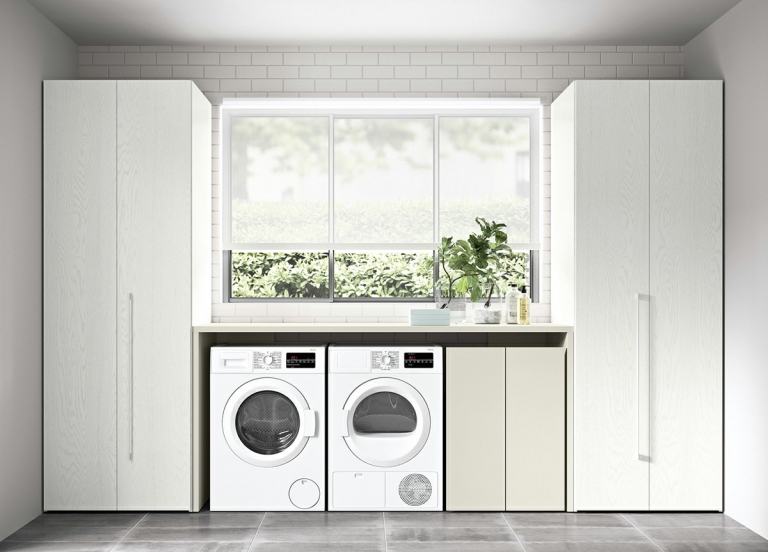 - Erhöhte Waschmaschine und Trockner – Werden die Waschmaschine und der Trockner etwas höher in den Schrank eingebaut, erleichtert das natürlich die Arbeit mit ihnen. Nicht ohne Grund entscheiden sich immer mehr Hausfrauen für einen hohen Ofen, der denselben Vorteil mit sich bringt. Zum Be- und Entladen der beiden Maschinen muss man sich dann nicht jedes Mal bücken.