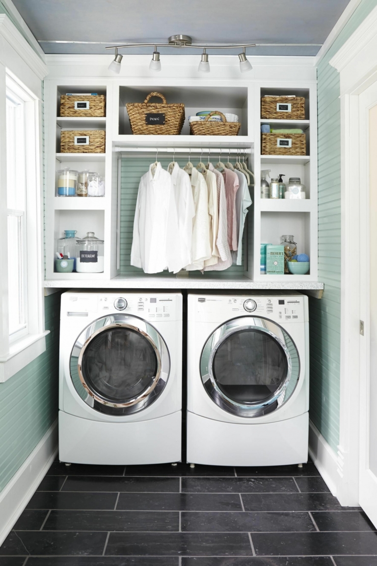 - Verstauen Sie Waschmaschine und Wäschetrockner in raumhohen Schränken und stellen Sie sie dort gegebenfalls übereinander, falls nicht genug Platz vorhanden ist, um sie nebeneinander aufzustellen.