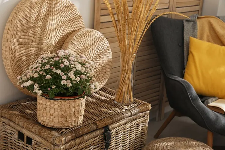 Es gibt Körbe in Form von Truhen, die besonders praktisch als Alternative zum Couchtisch sind, denn Sie kommen mit Stauraum daher. Die Oberfläche kann etwas uneben sein und Gegenstände mit kleinem Boden (z. B. Gläsern) keine sonderlich stabile Unterlage bieten. Doch hier können Sie sich einen einfachen Trick zunutze machen: Legen Sie entweder ein Brett auf den Korb oder noch besser ein Tablett. Darauf können dann auch Dekorationen arrangieren und bei Bedarf bequem mithilfe des Tabletts von der Truhe nehmen, um sie zu öffnen.
